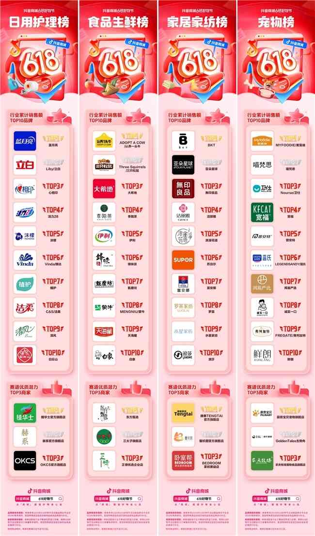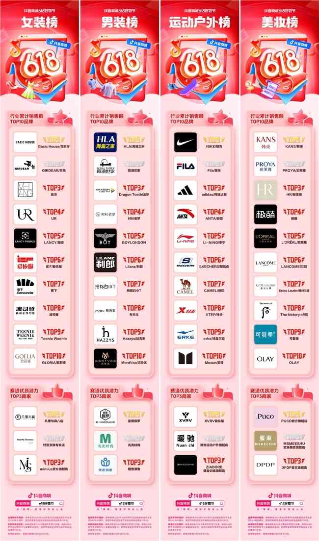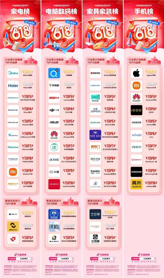 抖音(yīn)電(diàn)商特别推出品類榜單,涵蓋電(diàn)腦(nǎo)數(shù)碼、家(jiā)具家(jiā)裝、美(měi)妝、運動戶外(wài)等類目。按照(zhào)全平台♠支付GMV數(shù)據篩選各行(xíng)業(yè)TOP10品牌,同時(shí)基于活動期間(jiān)支付訂單量,選取了(le±)行(xíng)業(yè)TOP3商家(jiā)。快(kuài)來(lái)看(kàn)看(kàn),哪些(xiē)品牌備受消費(f♥èi)者青睐、拔得(de)頭籌,又(yòu)有(yǒu)哪些(xiē)優質潛力商家(jiā)脫穎而出?